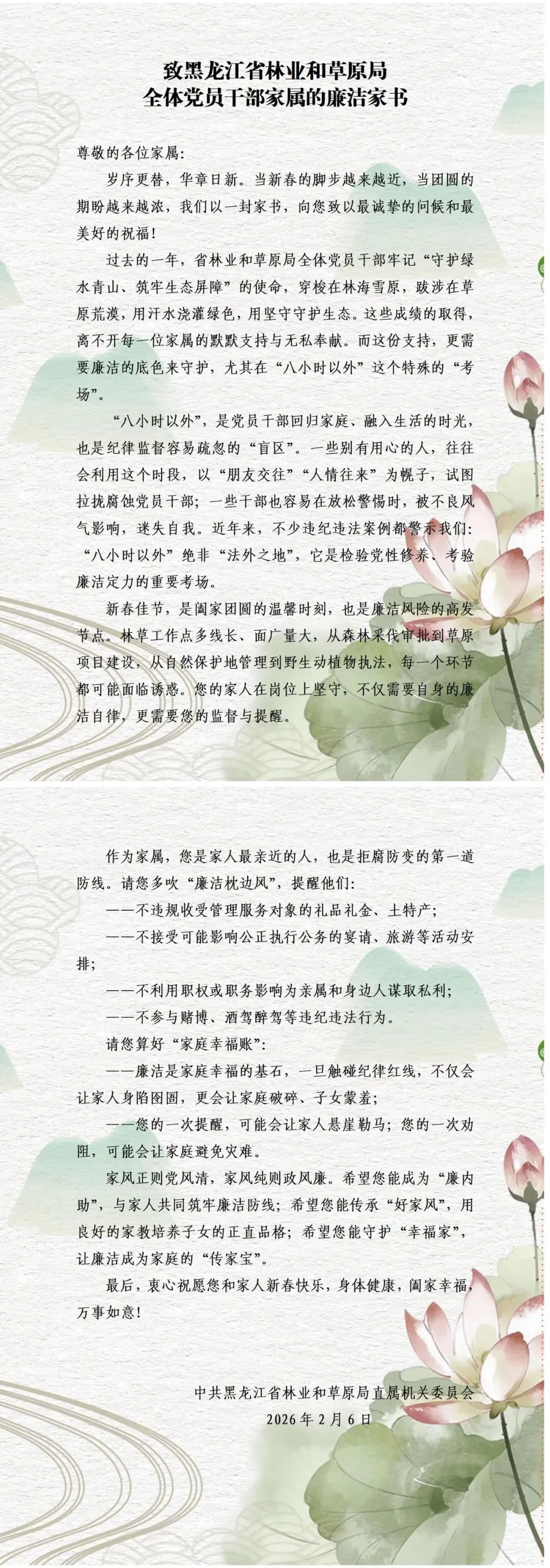 >致黑龙江省林业和草原局全体党员干部家属的廉洁家书
