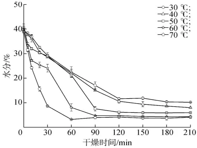 图2展示了不同热风干燥温度下皂角刺含水率随时间(0~210 min)的变化曲线。随着干燥时间的延长,各温度下的含水率均逐渐下降;温度升高显著缩短了达到相同含水率所需的干燥时间,且干燥终点含水率随温度升高而进一步降低,表明提高温度能够加速水分脱除并促进物料干燥。