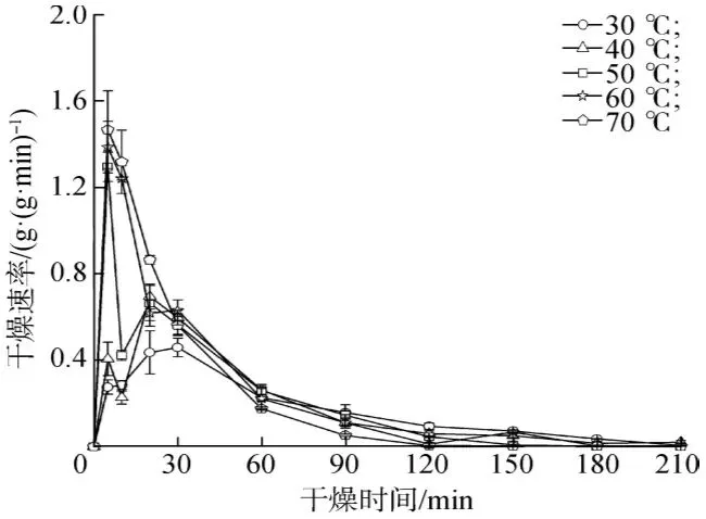 图3描述了不同干燥温度下皂角刺干燥速率随时间变化的趋势。在干燥前期(0~90 min),干燥速率随时间的延长呈现先增加后降低的趋势,而在90 min后趋于稳定;温度升高显著提升了干燥速率,说明高温有助于加快皂角刺内部水分的迁移与蒸发,但后期由于内部传质阻力增大,速率不再明显上升。