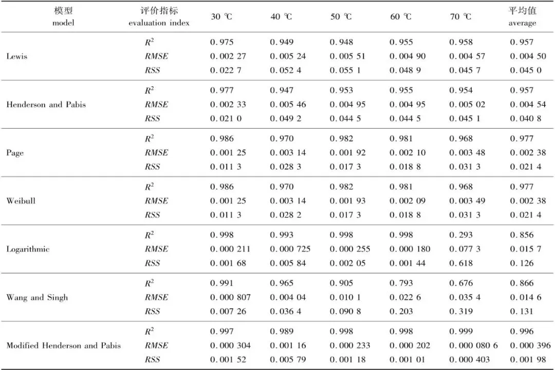 表 1 皂角刺热风干燥过程的不同干燥模型拟合结果