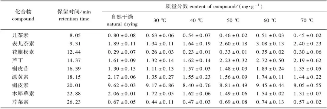 表 2 HPLC 测定热风干燥温度对皂角刺中多酚化合物含量影响