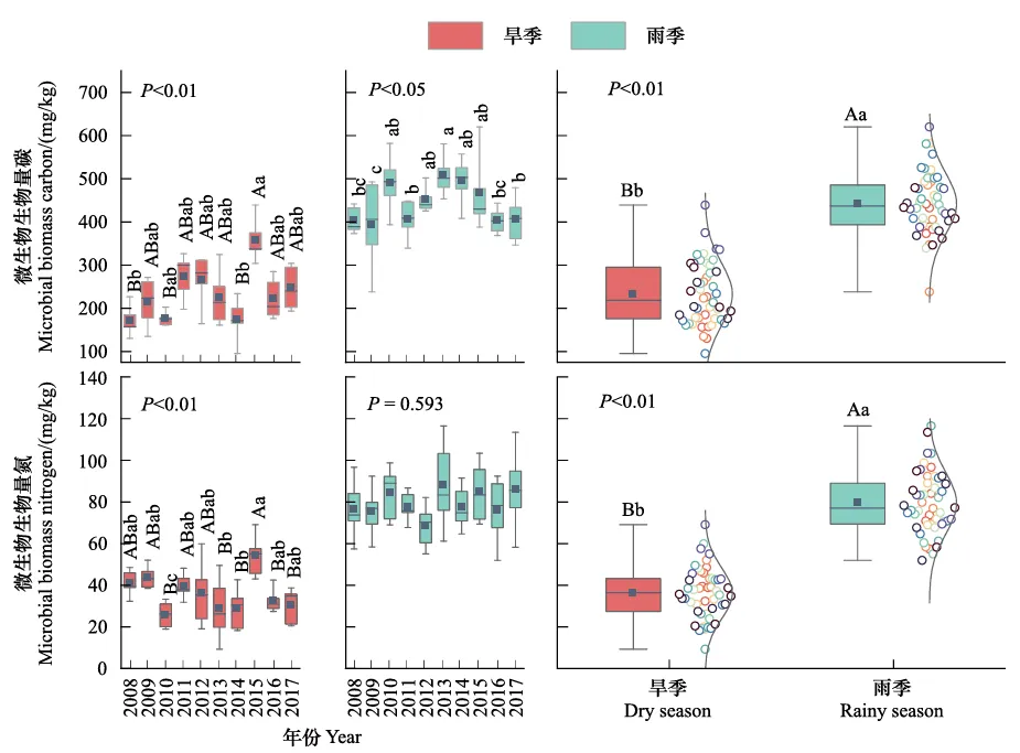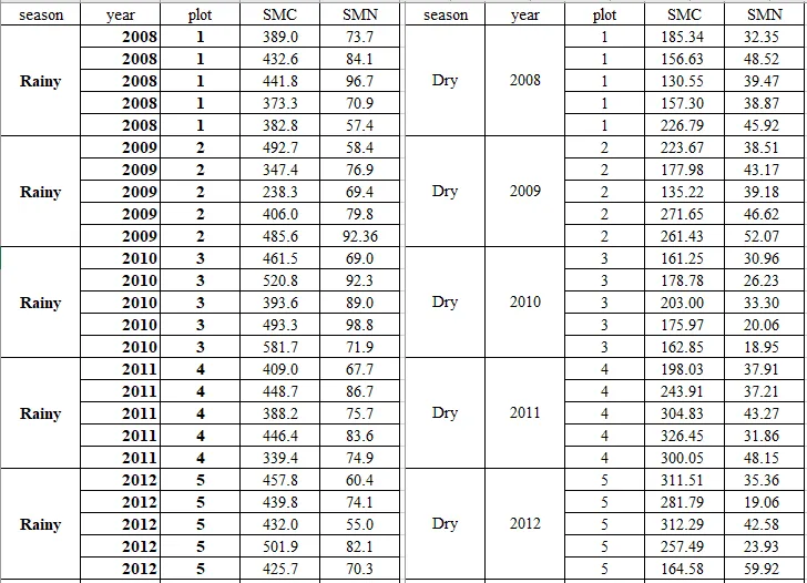 为减少土壤空间差异带来的误差,土壤样品的采集,于每个土壤样品使用直径为8.5cm的不锈钢取样器,随机采集8个样品(0-20cm),充分混合后形成一个样品。然后将土样低温保存,4h内送至实验室,除去石块、碎屑、细根等杂质,用2mm的土壤筛过筛。然后分成三部分,第一部分风干,用于土壤化学性质分析;第二部分在4℃下保存,用于土壤生物特性分析;第三部分留为备用。每年分别于雨季8月份和旱季12月份进行土壤样品采集。