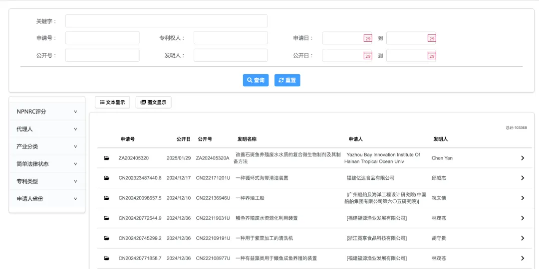 三亚市知识产权保护中心于2025年10月正式发布海洋渔业产业专利导航项目成果,并于2026年1月同步上线了基于专利导航分析构建的海洋渔业产业专利数据库。该数据库涵盖专利检索、政策洞察、产业链图谱、专利导航等七大功能模块,旨在为相关企业、科研机构及政府部门提供全面的知识产权数据支撑与决策参考。目前,数据库已对外开放使用,数据库访问地址:http://database.npnrc.com/industry/web?seafish,可复制链接至浏览器打开,或直接点击文末“阅读原文”进入。