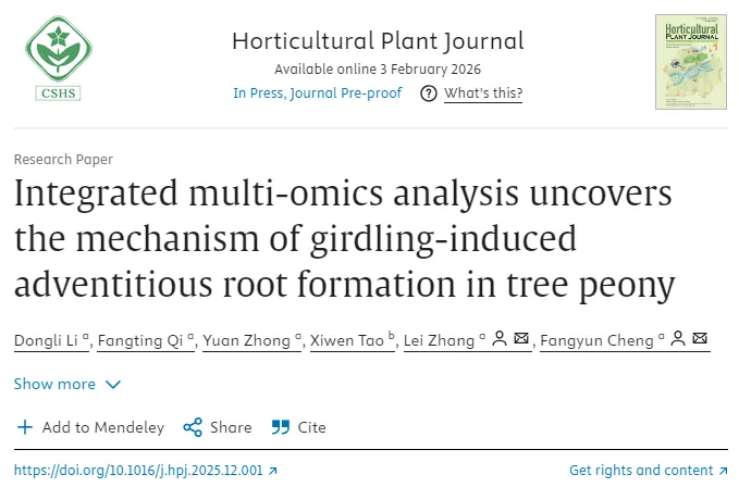 近日,Horticultural Plant Journal在线发表了北京林业大学成仿云教授团队题为“Integrated multi-omics analysis uncovers the mechanism of girdling-induced adventitious root formation in tree peony(多组学解析环剥诱导牡丹不定根形成机理)”的研究论文。