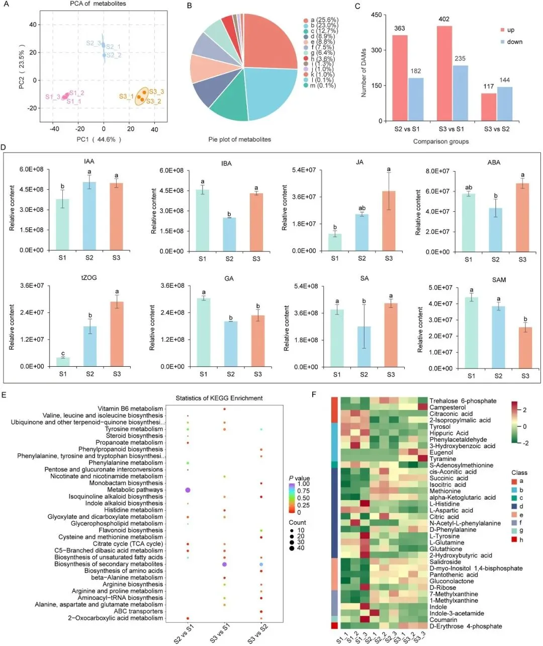 (2)转录组和代谢组分析表明,DEGs主要富集在植物激素信号转导、淀粉与蔗糖代谢、苯丙素类生物合成等通路;而DAMs显著富集在代谢途径、三羧酸循环、次生代谢物生物合成等通路。在不定根形成过程中,八种内源激素或前体物质相对含量发生了明显变化。
