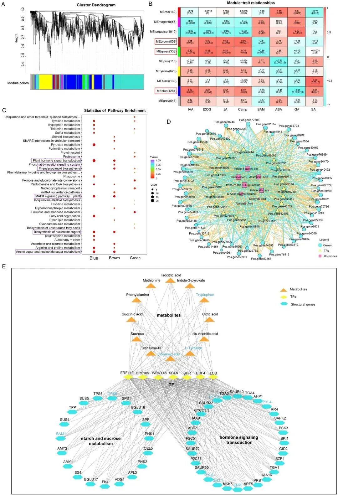 (3)WGCNA分析挖掘出7个核心转录因子(e.g. PrSCL8, PrSHR2, PrERF109)以及激素与糖类相关基因PrSAUR32、PrMKK5、PrSUS5、PrTPS5等可能参与调节牡丹不定根形成。