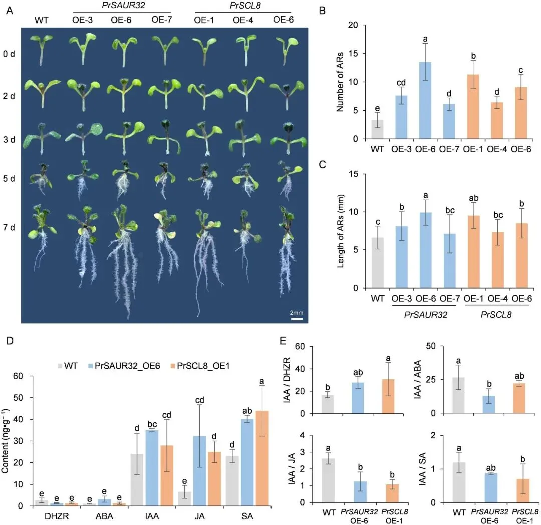 (4)转基因实验表明,过表达PrSAUR32和PrSCL8可以显著促进拟南芥不定根生长;过表达株系中不定根数量为野生型的2 ~ 3倍,不定根根长也比野生型长。进一步分析,发现过表达株系PrSAUR32-OE-6和PrSCL8-OE-1中的IAA、JA和SA含量显著高于野生型。