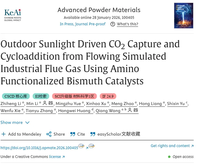 随着全球碳排放量持续增长,工业烟气中低浓度CO2(约15%)的直接捕集与资源化利用成为碳中和领域的关键挑战。传统方法往往需要高纯度CO2和苛刻反应条件,限制了实际应用。近日,北京林业大学团队在《Advanced Powder Materials》发表研究成果,开发了一种氨基功能化铋基催化剂(BNOC-TEPA),首次实现了在户外自然光照下对流动模拟工业烟气的直接CO2捕集与环加成转化。