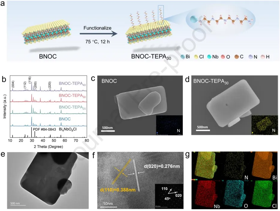 BNOC-TEPA通过熔盐法合成BNOC后,在75°C乙醇中与TEPA回流12小时制得(图1a)。XRD图谱显示所有样品均与标准BNOC卡片(PDF#84-0843)匹配,晶体结构在TEPA嫁接后保持稳定(图1b)。SEM和TEM图像表明,BNOC-TEPA30保留1-3 μm方形纳米片结构,元素映射证实氮均匀分布(图1c-g),证明TEPA成功嫁接。