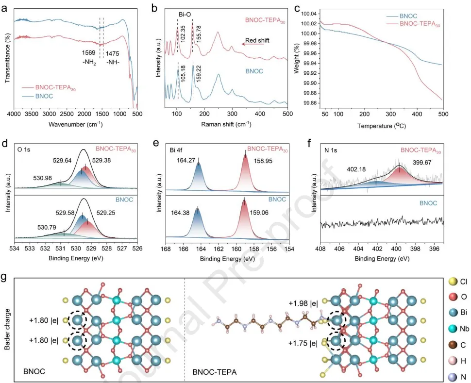 FTIR光谱中1569 cm⁻¹(伯胺)和1475 cm⁻¹(仲胺)特征峰证实TEPA嫁接(图2a)。Raman光谱显示BNOC-TEPA30的Bi-O振动红移3 cm⁻¹,表明TEPA与BNOC强相互作用(图2b)。XPS分析揭示Bi 4f结合能负移,N 1s谱存在中性胺与配位胺峰,证实Bi-N键形成(图2d-f)。Bader电荷计算表明,配位Bi位点电子密度降低(Lewis酸性增强),非配位Bi电子密度增加,呈现界面极化效应(图2g)。