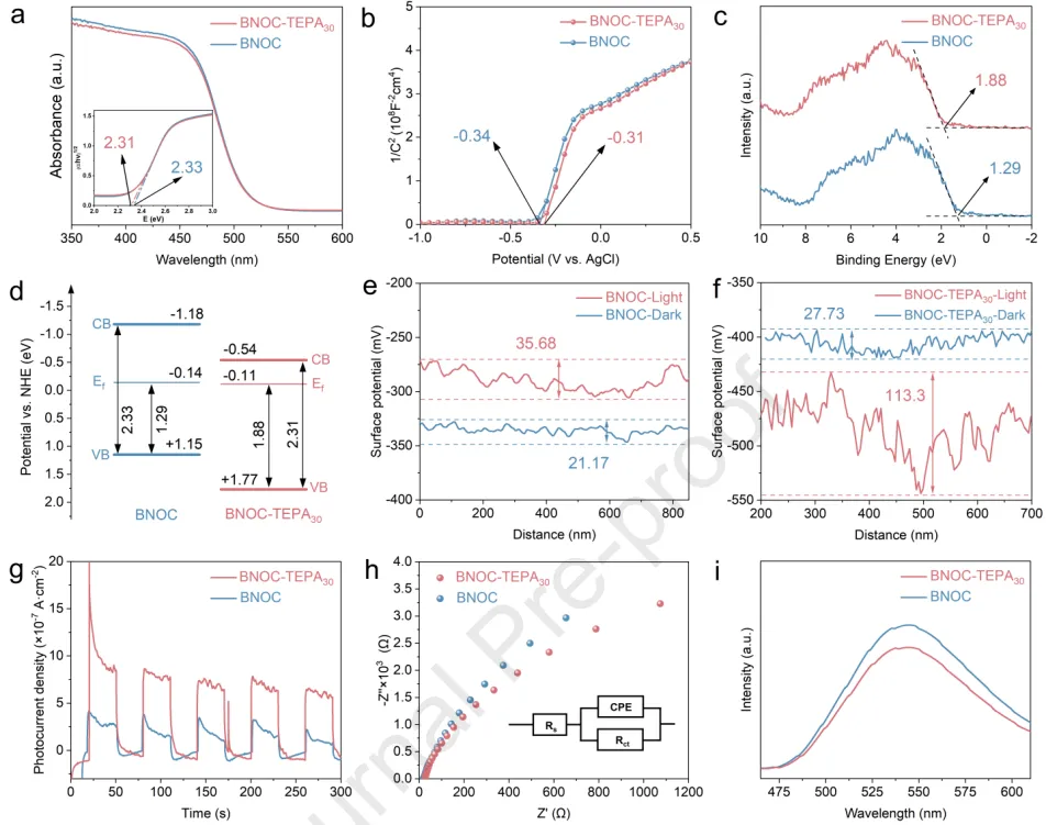 UV-Vis DRS显示BNOC-TEPA30带隙窄化至2.31 eV,光吸收边红移(图4a)。Mott-Schottky测试表明其费米能级为-0.31 eV vs. Ag/AgCl,VB-XPS确定价带位置上移(图4b-d)。KPFM揭示光照下表面电势差增加5.9倍,瞬态光电流提升3倍,EIS弧半径减小,PL强度淬灭,均证实TEPA嫁接显著促进电荷分离与迁移(图4e-i)。