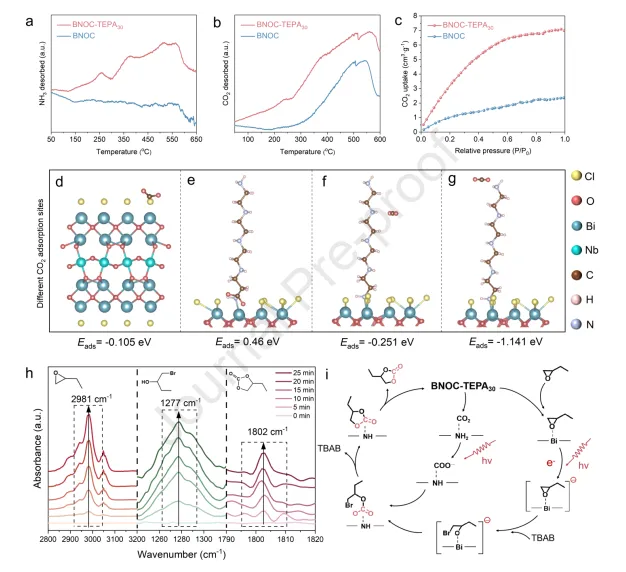 机理深度解析:结合原位FTIR和DFT计算,揭示了TEPA增强CO2吸附与活化、促进电荷分离的全过程。