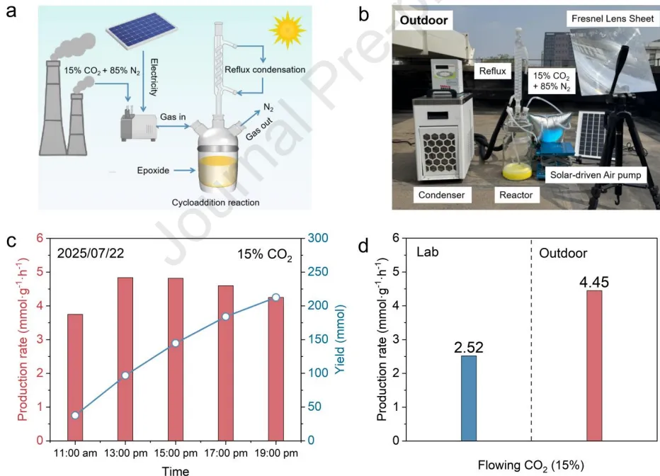 户外规模化验证:100倍放大实验表明,模拟烟气(15% CO2)在自然光照下可实现4.45 mmol·g⁻¹·h⁻¹的产率,验证了实际应用潜力。