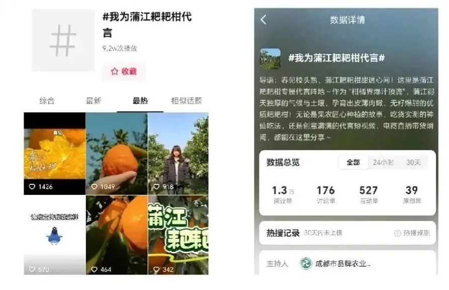 截至目前,全网相关内容累计曝光量突破10.5万次,其中抖音话题 #我为蒲江耙耙柑代言 播放量超9.2万次;用户互动热情高涨,收获点赞超5000次,评论与讨论逾200条——每一帧画面,都是年轻人对土地的深情告白。
