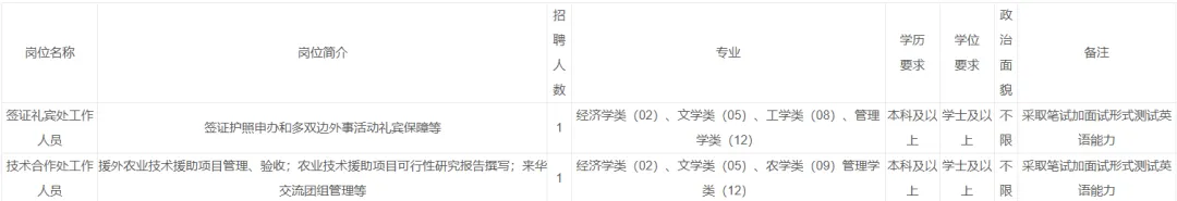 农业农村部国际交流中心是农业农村部直属事业单位,主要职能是为农业国际合作交流工作提供外事支撑保障服务。因工作需要,拟面向社会公开招聘2名编制外工作人员。现将有关事宜公告如下:一、岗位要求二、应聘条件1.拥护中华人民共和国宪法,遵守国家法律法规,具有良好的品行,纪律观念强,热爱“三农”工作。2.年龄38周岁以下(1988年2月1日以后出生)。3.身心健康,能适应岗位要求,无纹身或明显疤痕。4.本人、家庭成员以及主要社会关系中没有违纪、违法和犯罪记录(含行政拘留),本人没有被开除公职的记录。三、招聘程序(一)投递简历应聘者应于2026年3月6日(周五)前将个人简历、身份证复印件、户口本复印件、外语水平等级证书复印件、获奖证书复印件、农业农村部国际交流中心公开招聘报名登记表等电子材料发送至Qzlbmail@163.com,邮件主题格式参考“姓名-报考岗位-学校”。(二)笔试通过资格审查的应聘人员将收到手机短信或电话提醒,请应聘人员保持手机畅通。笔试成绩按百分制计算,合格线为60分。笔试时间另行通知。(三)面试根据笔试成绩,按1:5的比例确定面试人选,如有考生放弃面试,按照笔试成绩从高到低依次递补(递补人选的时间,原则上截止到面试前1天15:00)。(四)体检根据总成绩1:1等额确定体检人员,电话通知有关人员参加体检。体检参照现行公务员录用体检标准组织实施体检。体检时间和地点待定。(五)录用体检合格后,组织签订劳务派遣合同。四、有关待遇根据聘用者资历,按照相关标准发放,提供五险一金,住宿自理。五、联系人及联系方式联系人:张老师、杨老师联系电话:010-59191458、59191391六、其它有关事宜本公告相关信息可在农业农村部国际交流中心网站和中国农业农村人才网查询。附件:附件:农业农村部国际交流中心公开招聘报名登记表.docx觉得不错,烦请关注、点亮