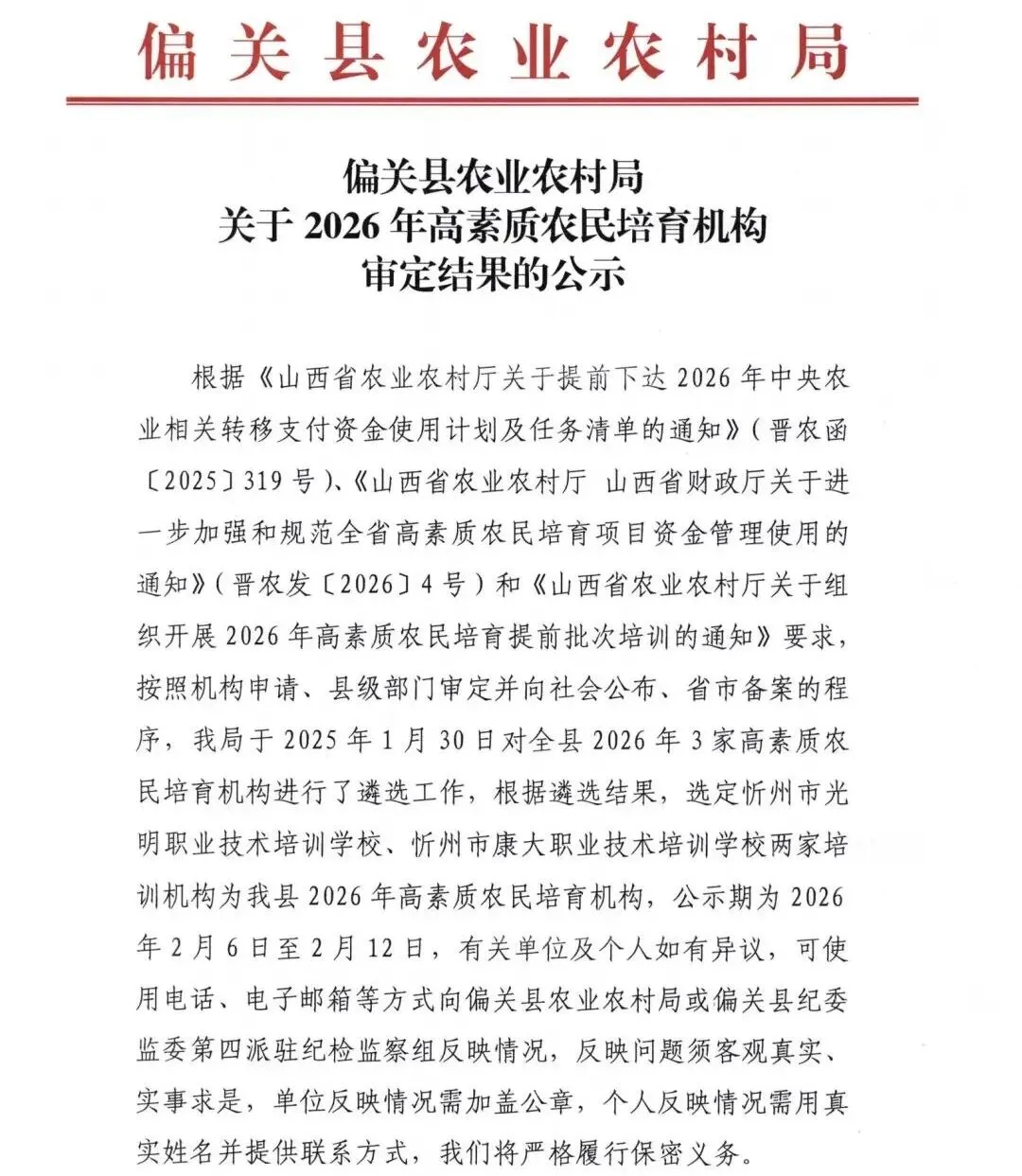 >偏关县农业农村局关于2026年高素质农民培育机构审定结果的公示