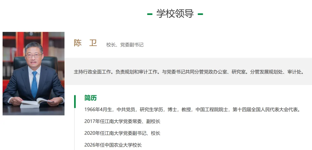 日前,中央批准:陈卫同志任中国农业大学校长(副部长级)、党委副书记;孙其信同志不再担任中国农业大学校长职务。2月6日,中国农业大学召开教师干部会议。中央组织部副部长张光军同志到会宣布中央决定并讲话,教育部副部长、党组成员、总督学王嘉毅同志,北京市委常委、组织部部长李成林同志出席会议并讲话。中国农业大学党委书记钟登华同志主持会议。
