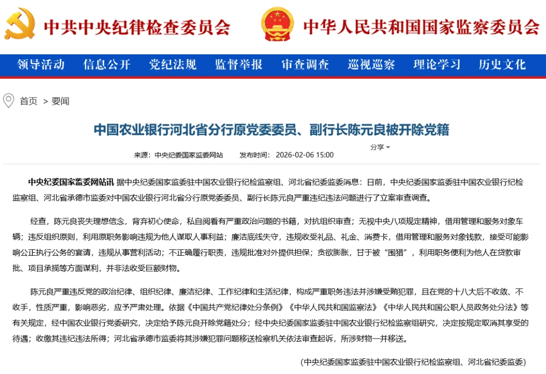中央纪委国家监委网站讯 据中央纪委国家监委驻中国农业银行纪检监察组、河北省纪委监委消息:日前,中央纪委国家监委驻中国农业银行纪检监察组、河北省承德市监委对中国农业银行河北省分行原党委委员、副行长陈元良严重违纪违法问题进行了立案审查调查。经查,陈元良丧失理想信念,背弃初心使命,私自阅看有严重政治问题的书籍,对抗组织审查;无视中央八项规定精神,借用管理和服务对象车辆;违反组织原则,利用原职务影响违规为他人谋取人事利益;廉洁底线失守,违规收受礼品、礼金、消费卡,借用管理和服务对象钱款,接受可能影响公正执行公务的宴请,违规从事营利活动;不正确履行职责,违规批准对外提供担保;贪欲膨胀,甘于被“围猎”,利用职务便利为他人在贷款审批、项目承揽等方面谋利,并非法收受巨额财物。陈元良严重违反党的政治纪律、组织纪律、廉洁纪律、工作纪律和生活纪律,构成严重职务违法并涉嫌受贿犯罪,且在党的十八大后不收敛、不收手,性质严重,影响恶劣,应予严肃处理。依据《中国共产党纪律处分条例》《中华人民共和国监察法》《中华人民共和国公职人员政务处分法》等有关规定,经中国农业银行党委研究,决定给予陈元良开除党籍处分;经中央纪委国家监委驻中国农业银行纪检监察组研究,决定按规定取消其享受的待遇;收缴其违纪违法所得;河北省承德市监委将其涉嫌犯罪问题移送检察机关依法审查起诉,所涉财物一并移送。来源:中央纪委国家监委网站