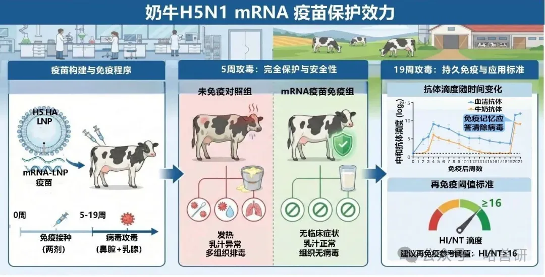 该研究显示,H5 mRNA疫苗具有良好安全性,接种后不影响奶牛产奶且无不良反应;免疫应答强,能在血清和乳汁中诱导高水平抗体;保护效力达100%,攻毒后所有免疫奶牛均获完全保护,体内未检出病毒;免疫记忆持久,首次免疫19周后,即便抗体下降,仍有三分之二的奶牛可完全抵御病毒攻击。