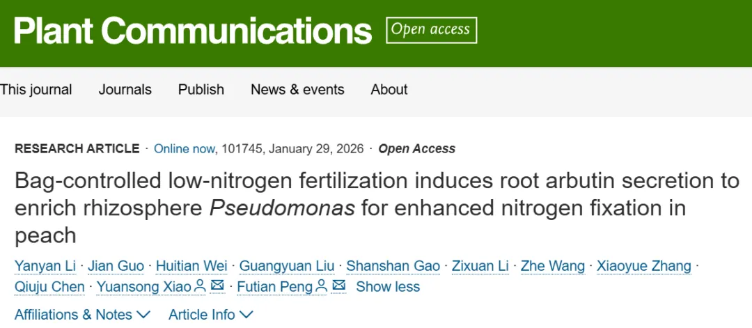 近日,山东农业大学园艺科学与工程学院彭福田团队在《Plant Communications》发表了题为“Bag-controlled low-nitrogen fertilization induces root arbutin secretion to enrich rhizosphere Pseudomonasfor enhanced nitrogen fixation in peach”的研究论文,揭示了袋控精稳低氮施肥技术通过“根际对话”增强生物固氮的微观机制。
