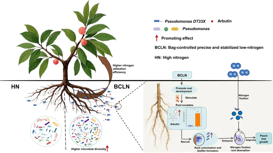 研究表明,袋控精稳低氮施肥显著提升桃树根际土壤微生物多样性,增加固氮微生物丰度及土壤固氮酶活性。同时,袋控精稳低氮施肥诱导桃树根系分泌熊果苷,该物质介导固氮微生物假单胞菌属DT33X菌株的富集,增加土壤nifH基因拷贝数,增强其固氮能力,促进桃树氮素吸收及生长。本研究验证了袋控精稳低氮施肥技术的科学性与优越性,为植物-微生物互作提供了崭新的视角,也为在果园乃至其他作物体系中推广减氮增效、发展绿色可持续农业提供了坚实的理论支撑。