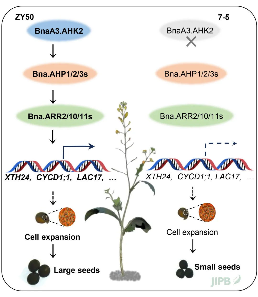 图2 甘蓝型油菜BnaA3.AHK2对油菜籽粒重量和大小的调控模型