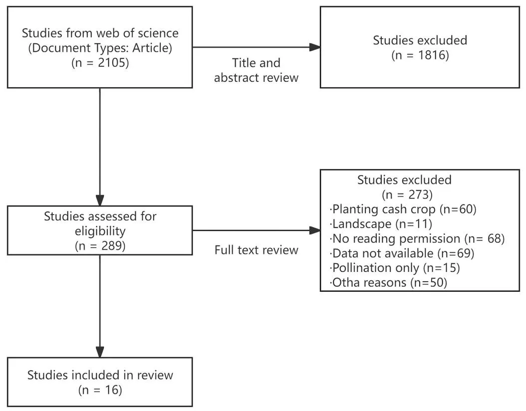 制定了涵盖主要粮食作物、农田边界类型、天敌相关生物及生态服务等维度的检索式,严格排除综述类文献,仅纳入 “文章” 类型的研究,确保检索结果的针对性与有效性。