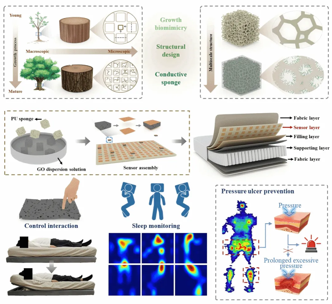 近日,安徽农业大学材料与化学学院安徽省健康睡眠家居产品工程中心陈玉霞教授团队在《Advanced Science》(中科院一区TOP期刊,IF=15.6)发表了题为 “Biomimetic Multiscale-Structured Biomass Graphene/Polyurethane Sponge Composite for Flexible Pressure Sensors and Intelligent Cushioning Materials”的最新研究成果,报道了在生物质基海绵柔性压力传感器方面的重要进展。
