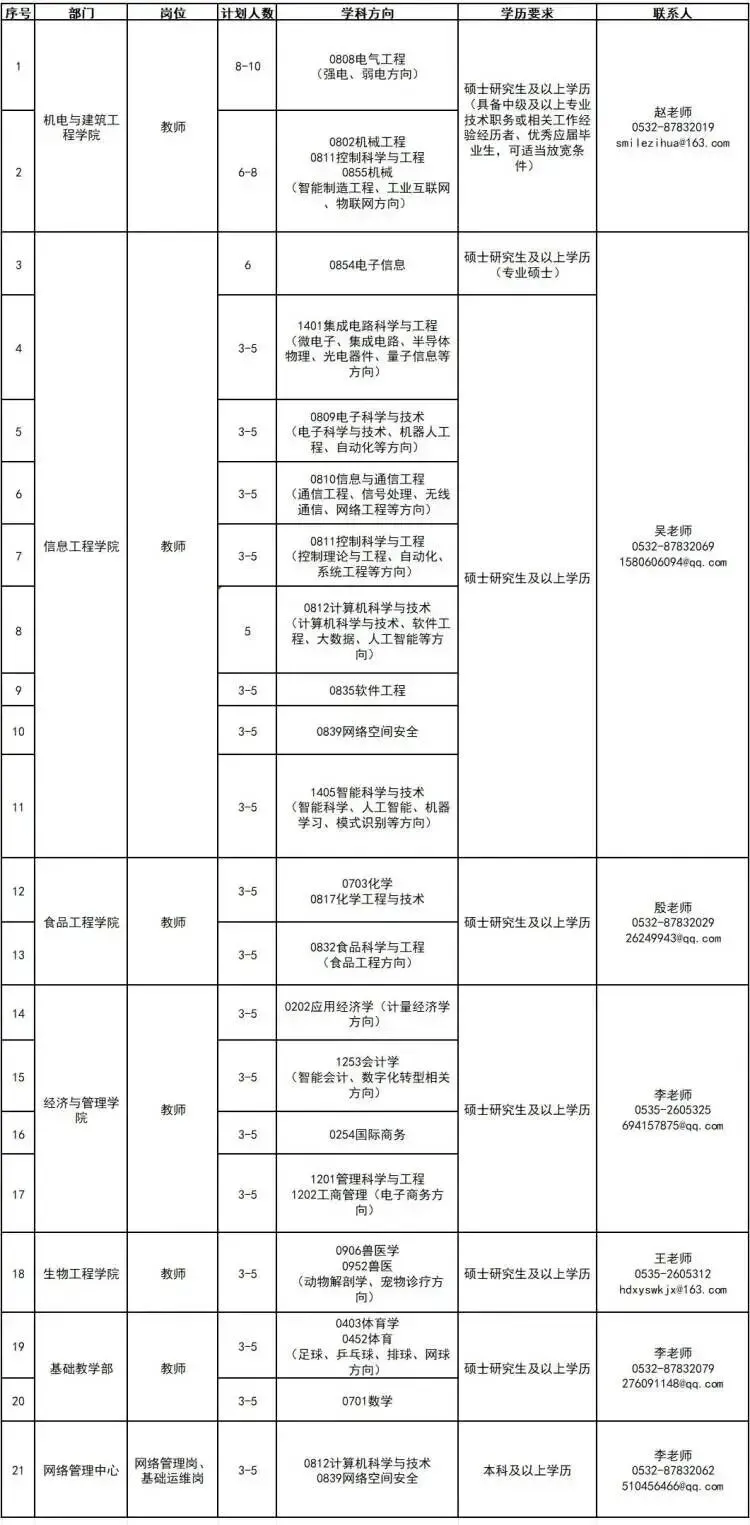 专任教师应聘人员请下载并填写《青岛农业大学海都学院应聘报名表》(表格第2页需附学习成绩证明),连同学历学位证、职称证、教师资格证、执业资格证、荣誉证书等相关证书电子版扫描件通过电子邮件附件形式(附件以“应聘岗位+姓名+专业+毕业学校”命名)发送至各学院(部)招聘联系人邮箱(邮件主题为“应聘岗位+所学专业+姓名”)。