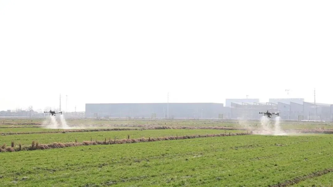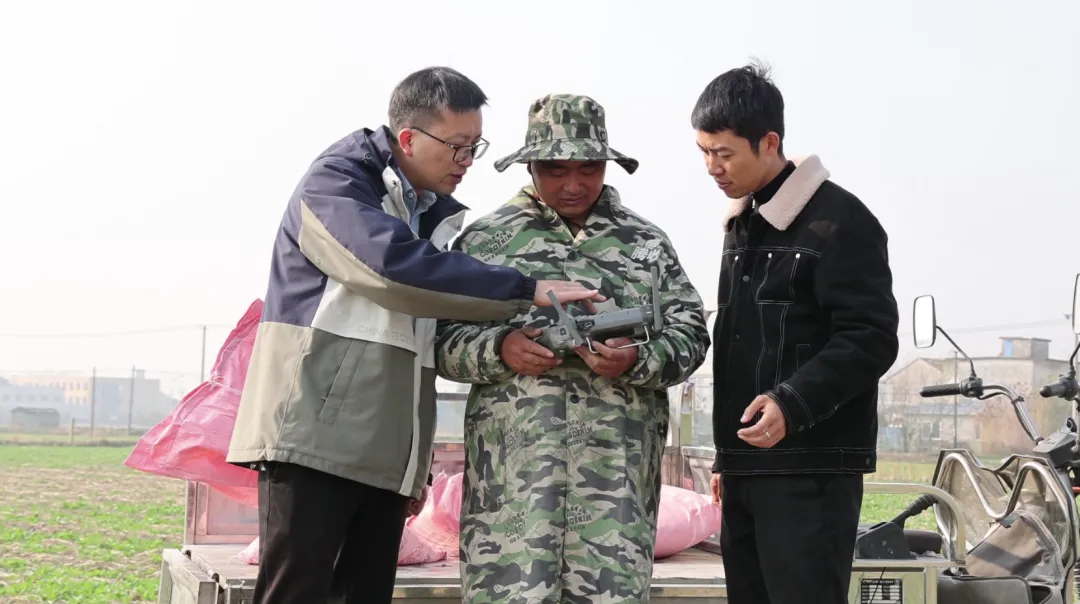 在南陵袁禾农业生产专业合作社的麦田里,农技人员与合作社负责人正共同查看小麦生长状况,指导农机手操作无人机进行除草作业。