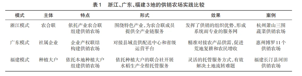 供销农场依托供销社市县镇村四级农事服务资源,整合乡镇、供销系统、村集体、农户及企业的力量,发挥着联农带农“基层枢纽引擎”作用,可有效解决土地流转难题,并打通全过程农业社会化服务的“最后一公里”,提升农业服务力和产品竞争力,实现其可持续发展。即供销农场作为现代农业经营的新型载体,把为农服务功能和经济发展功能有机地结合起来,可以突破长期以来供销合作社的发展困境。近年来,全国多地已形成零散式的供销农场建设实践,它们服务于乡村振兴战略,根据农业经营和供销合作社发展的趋势,针对发展困境,因地制宜,形成各自特色。笔者基于案例的典型性、差异性、获取信息的可行性3方面考虑,选取了浙江、广东、福建3地的供销农场实践案例。笔者于2023—2024年曾多次到广东惠州、佛山,浙江杭州,福建龙岩等地农村进行实地调研,通过问卷调查、深入访谈、实地观察、收集档案等方式获取调研信息资料,对资料进行整理分析,并从供销农场建设主体、主要特点、运作形式、主要效果等方面比较3地供销农场的运行特色。如下表1所示,与浙江依靠自上而下、产业联合的农合联推进模式不同,广东的供销农场是依靠社属企业上下贯通的产权联结组建,而福建龙岩则是依托当地种植大户与农民专业合作社组建供销农场,3种模式的推进主体、组建方式、运行模式等有所不同,但是都呈现良好的运作效果。