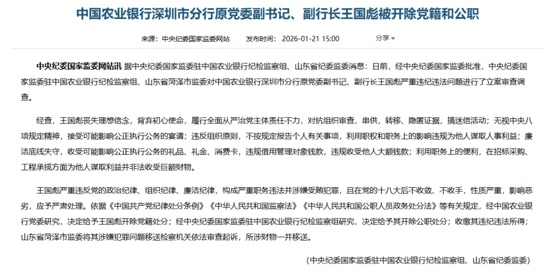 1月21日,中央纪委国家监委网站的一则通报,在金融圈里炸开了锅:中国农业银行深圳市分行原党委副书记、副行长王国彪,因严重违纪违法被开除党籍和公职,涉嫌犯罪的问题也已移送检察机关审查起诉。这不是遥远的新闻,而是发生在我们身边的鲜活案例,给所有金融从业者再次敲响了警钟。