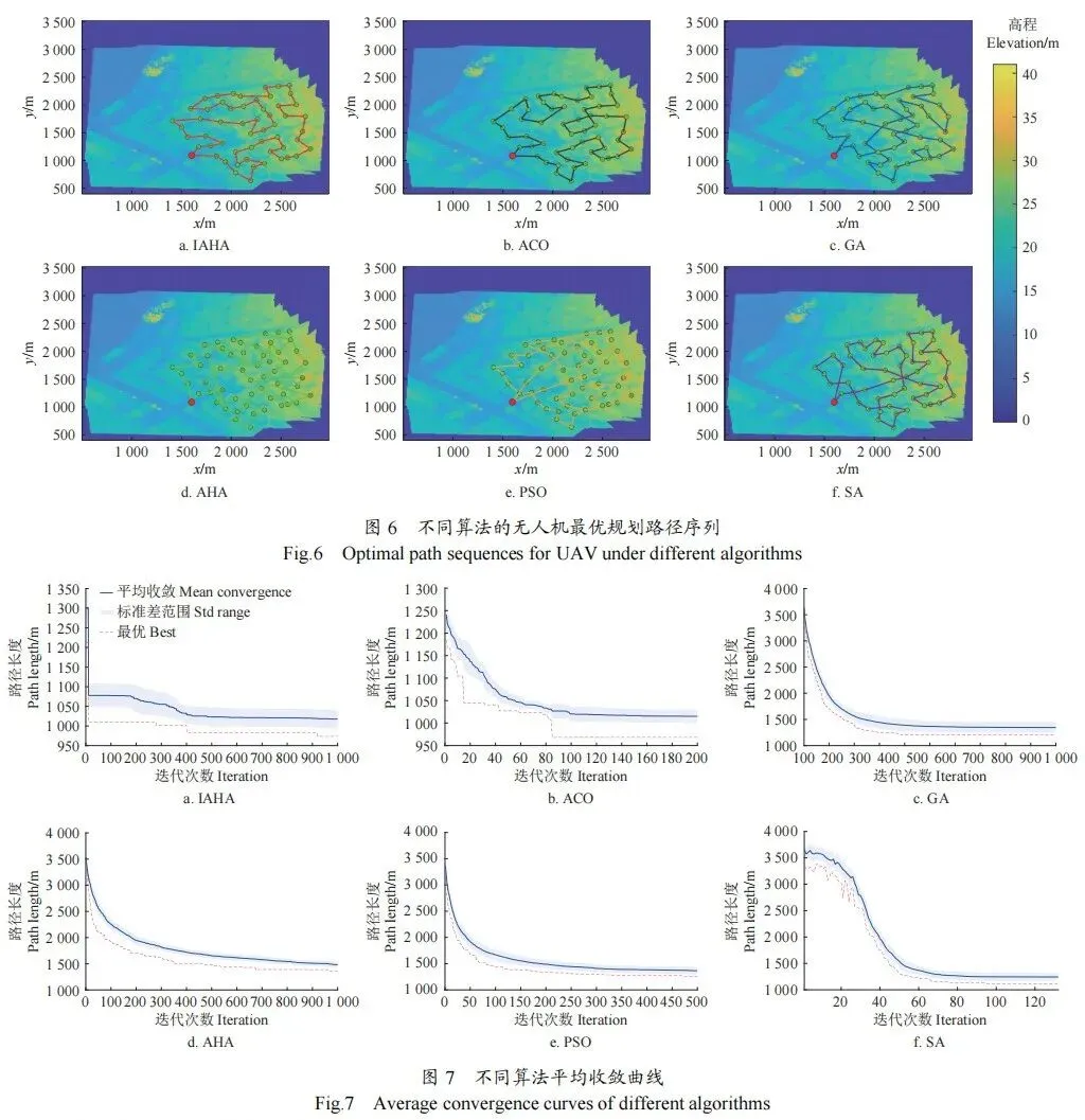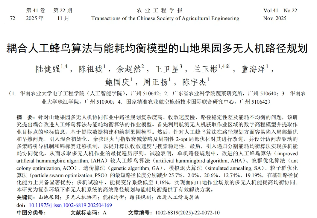 试验表明,单机路径规划中,改进的人工蜂鸟算法(improved artificial hummingbird algorithm, IAHA)较人工蜂鸟算法(artificial hummingbird algorithm, AHA)、蚁群优化算法(ant colony optimization, ACO)、遗传算法(genetic algorithm, GA)、模拟退火算法(simulated annealing, SA)、粒子群优化算法(particle swarm optimization, PSO)的最短路径长度分别减少25.7%、2.0%、20.6%、12.74%、19.19%,在基础路径优化能力上具备显著优势;多机试验中,能耗变异系数低至1.16%,实现面向山地作业场景的多无人机能耗高均衡协同。本研究为复杂环境下多无人机系统的高效路径规划与能耗均衡提供了有效解决方案。