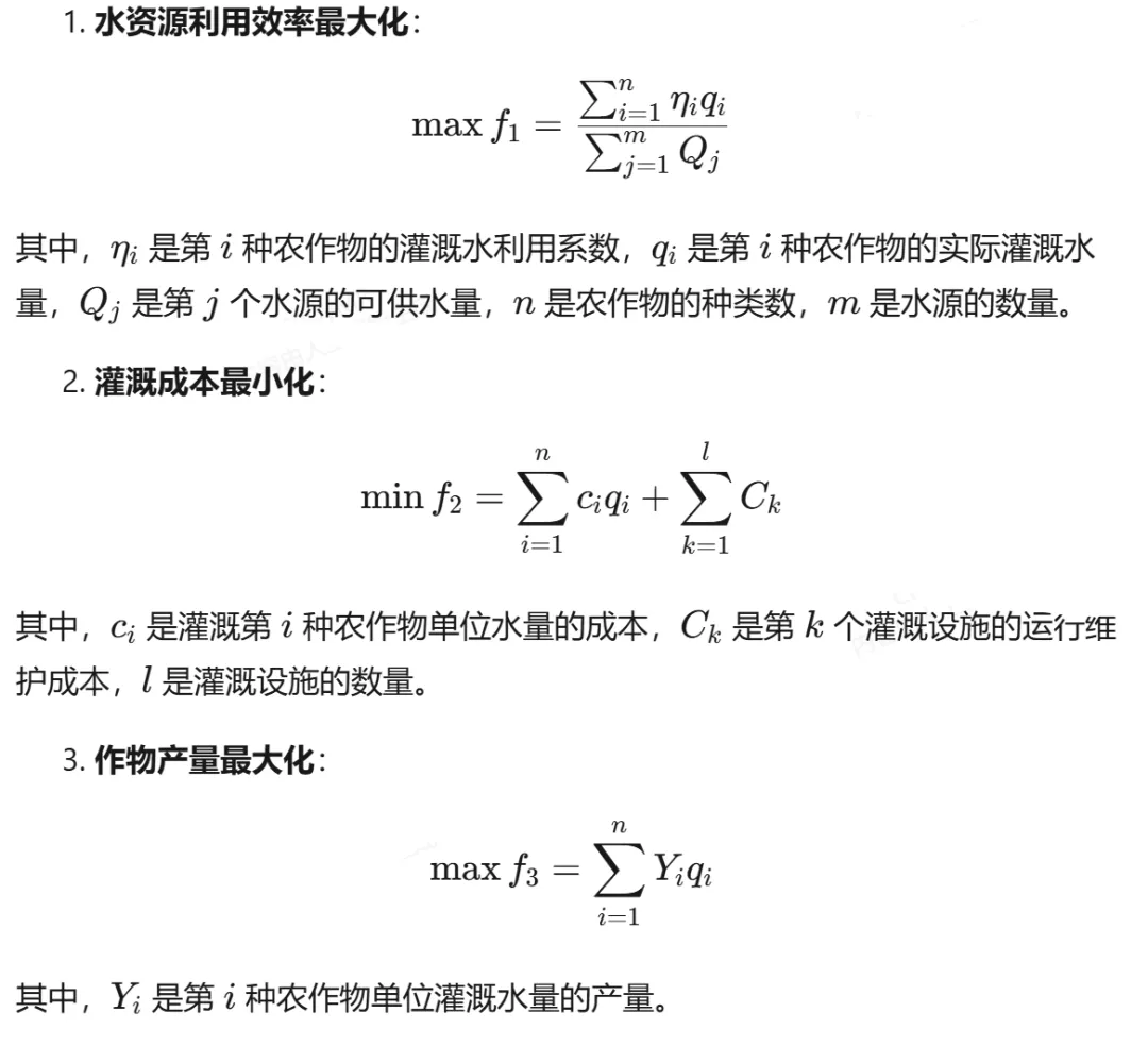农业水资源调度的目标通常是多方面的,本文综合考虑水资源利用效率、灌溉成本和作物产量等因素,构建如下多目标函数: