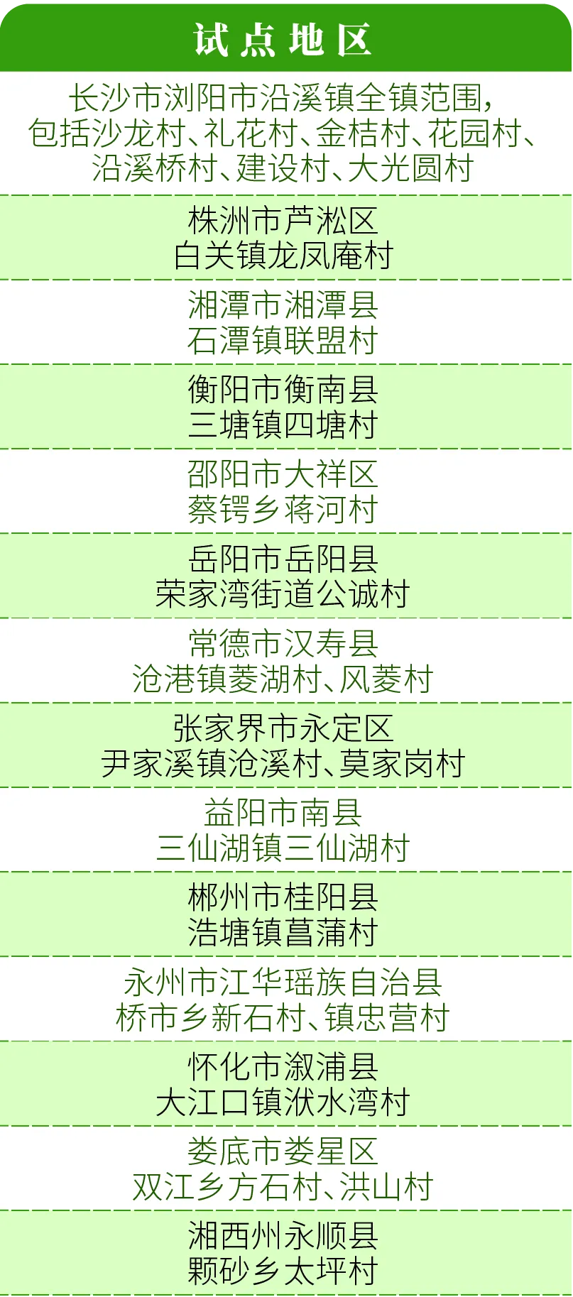 省级综合试点在长沙市浏阳市沿溪镇,其余市州自主选择试点地区。快来看看您的家乡是否“榜上有名”?