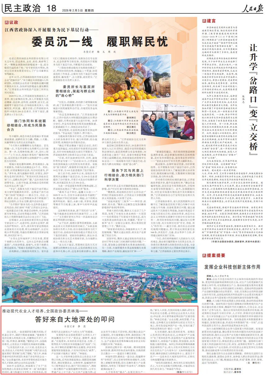 扎实的调研,催生更深的思考。前期在山东菏泽巨野县的走访,让林海对“产业振兴”有了更深的思考:该县特色产业蛋鸡养殖规模虽大,却面临产业链短、附加值低、抗风险能力弱的困境。如何让科研成果精准滴灌到县域特色产业,将人才技术优势转化为实实在在的生产力与竞争力?又如何构建长效机制,确保创新活力持续滋养乡土、惠及万千农户……这些来自大地深处的叩问,正转化为林海履职建言的新焦点。
