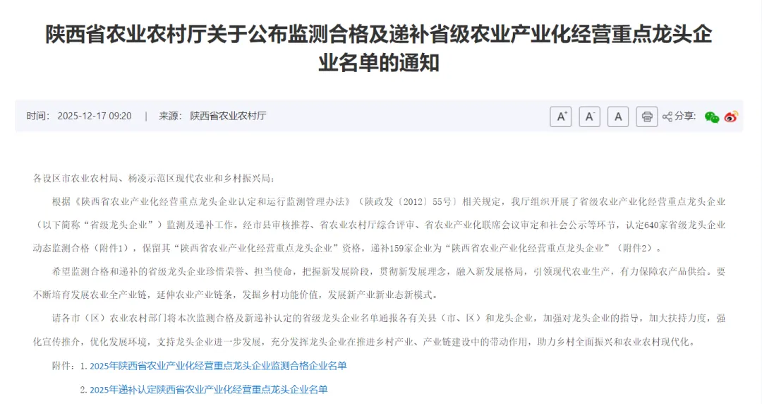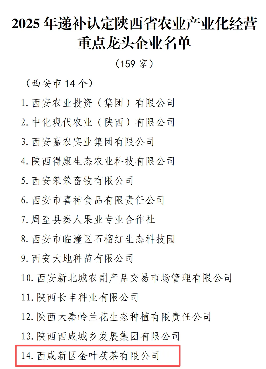 近日,陕西省农业农村厅公布了监测合格及递补省级农业产业化经营重点龙头企业名单,泾河新城入区企业西咸新区金叶茯茶有限公司成功递补为省级农业产业化经营重点龙头企业。
