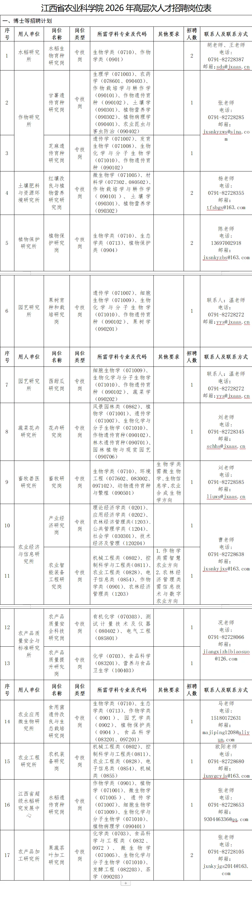 博士等招聘计划共21名,具体招聘岗位及要求详见《江西省农业科学院2026年高层次人才招聘岗位表》(附件1,以下简称《岗位表》)。