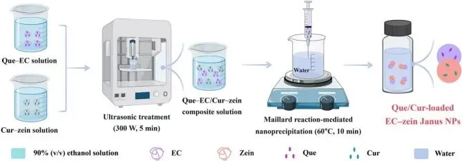 Fig. 1. Schematic diagram of Que/Cur-loaded EC–zein Janus nanoparticles prepared by Maillard reaction-mediated nanoprecipitation method.