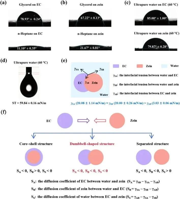 Fig. 4. The formation mechanism of EC–zein Janus NPs. Contact angles of glycerol and n-heptane on EC (a) and zein (b) at room temperature. (c) Contact angles of ultrapure water on EC and zein at 60 °C. (d) Surface tension of ultrapure water at 60 °C. (e) Schematic diagram of three-phase interfacial tensions of Janus NPs. (f) Possible equilibrium configurations of EC–zein composite NPs.