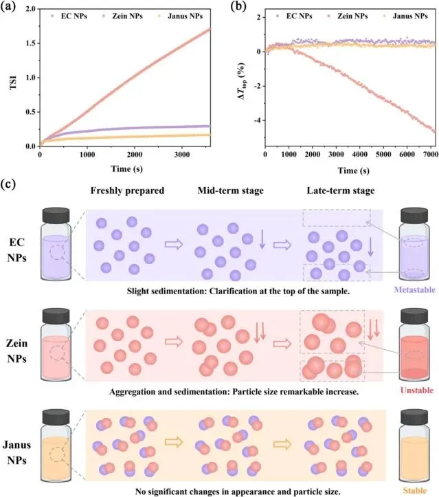 Fig. 6. Physical stability of EC–zein Janus NPs. TSI (a), average ΔTtop (b), and schematic diagram of unstable phenomenon (c) of EC NPs, zein NPs, and Janus NPs.