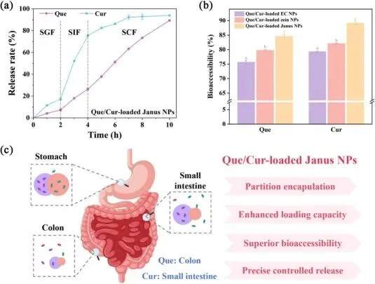 Janus 纳米颗粒可实现槲皮素和姜黄素的区域化包封,姜黄素因高疏水性主要包封于玉米醇溶蛋白结构域,槲皮素则主要存在于乙基纤维素结构域,对二者的包封率均超 94%,载药量也显著高于单一纳米颗粒;体外模拟消化实验表明,该颗粒可实现姜黄素在小肠、槲皮素在结肠的位点特异性控释,且二者的生物可及性显著提升,优于单一纳米颗粒载体。