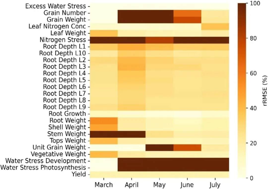 显示了目标时间段内作物特征的 rRMSE 损失(仅显示相对值,无单位,因为大多数特征的单位不同)。为了便于可视化,rRMSE 的阈值设置为 100%。损失峰值分别对应于水分胁迫发展(283%)、光合作用期间的水分胁迫(254%)和氮胁迫(241%)。每月 rRMSE 中位数的梯度表明,7 月份临近收获期的状态模拟效果更好。产量变量并非时间序列特征,始终与季末产量相关。