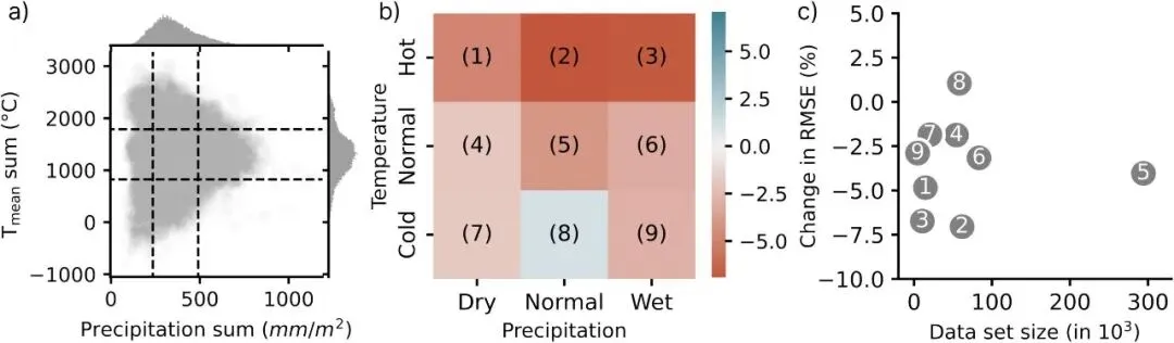 a ) 显示了基于 2 月至 6 月平均温度和降水量阈值定义的合成样本的二维分布。这决定了类别的划分,这些类别显示在 b) 中,并表示将一个类别与现场记录关联时均方根误差 (RMSE) 的变化。c) 表示每个类别的样本量与误差变化的关系。值得学习的细节: