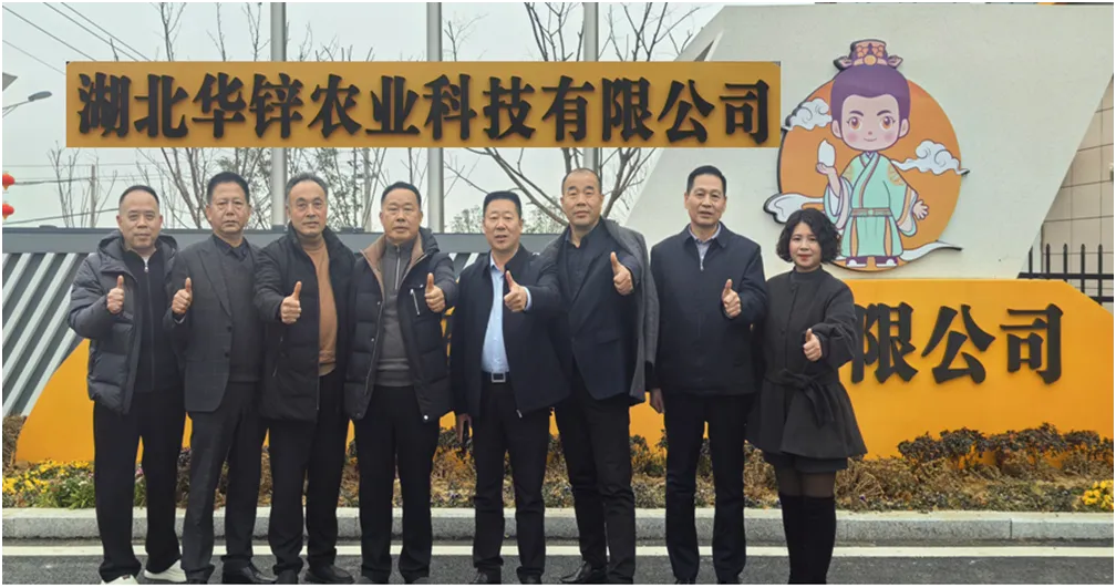 ▲十堰市孝感商会一行在湖北华锌农业科技有限公司门前合影留念