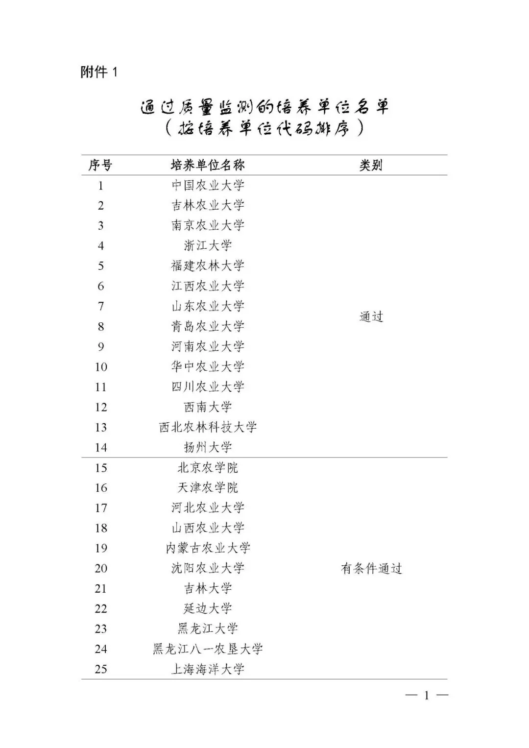 附件:1.通过质量监测的培养单位名单(按培养单位代码排序)