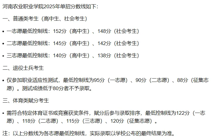 录取方式:(1)退役士兵考生根据职业适应性测试原始成绩从高到低择优录取。(2)普通高中类考生、社会考生根据录取成绩按照“分数优先、遵循志愿”原则,学校依照考生专业志愿顺序,按总成绩从高到低择优录取,录满为止。总分相同者,依次按照职业适应性测试成绩、语文、数学原始成绩高低排序录取。