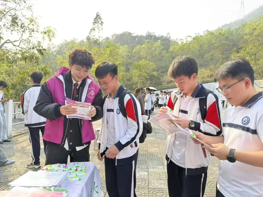 1月28日,揭泽培作为招生宣传大使,带领团队成员黄骞回到母校珠海市斗门第一中学开展线下寒招宣传活动。团队采用“校园摆摊”的形式,从学科优势、校园文化生活、食宿环境,历年招生分数线等各方面,向学弟学妹们展开详细介绍。