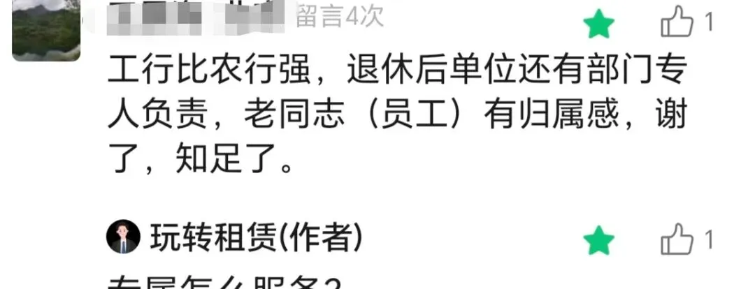 退休工行网友留言,工行整体比农行强,退休后单位还有专人负责,老同志员工有归属感,知足了。