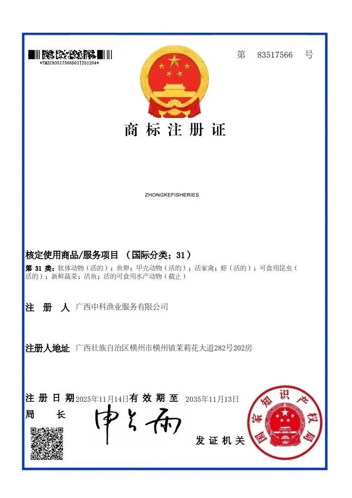ZhongkeFisheries®作为核心注册品牌,已完成全类别商标布局,其专利技术与团体标准的深度融合,彻底改变了传统鱼生产业“靠天吃饭、凭经验判断”的局限,使生产过程实现数据化、可视化、智能化管控。